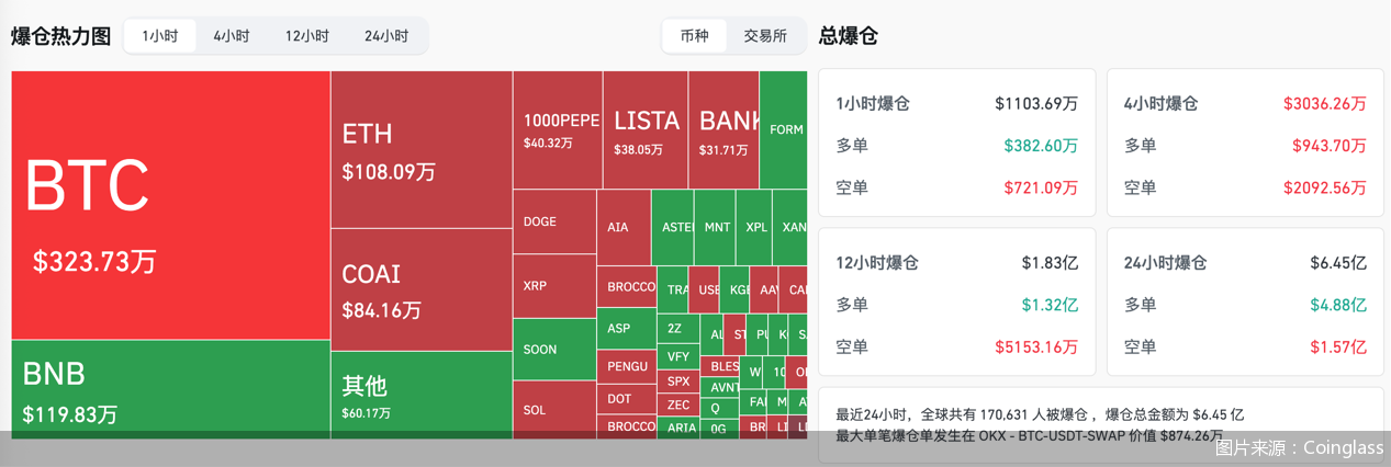 在避险情绪下,被拥趸视为“数字黄金”的比特币,近期和黄金在价格走势上呈现了一定的一致性。值得注意的是,在比特币价格的大幅波动下,市场爆仓同样呈现加剧态势。根据Coinglass的数据,截至10月8日17时30分的过去24小时里,全球共有170631人被爆仓,爆仓总金额为6.45亿美元,约合46亿元人民币,其中最大单笔爆仓单交易金额为874.26万美元。