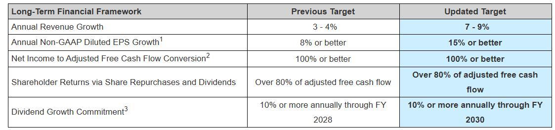 本周二在纽约举行投资者会议前,戴尔公布了更新的"长期财务框架",将年度营收增长预期从此前的3%-4%大幅提升至7%-9%,调整后每股收益(EPS)增长目标从8%或更高提升至15%或更高。新预期将延续至2030财年。