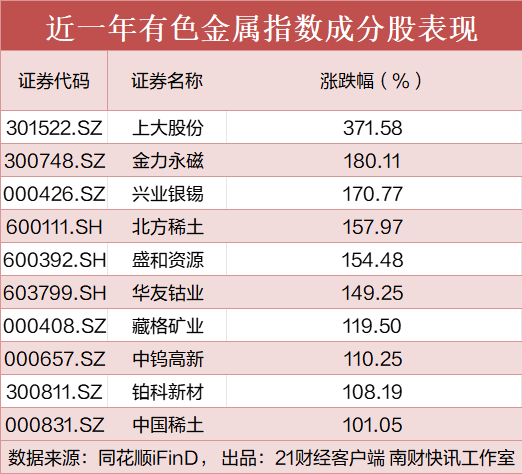 回顾近一年表现,A股指数有色金属(000819.SH)涨幅达到61.4%,显著跑赢大盘。涨幅排名前10的成分股更是都实现了股价翻倍,显示出有色板块在黄金等金属价格上涨背景下的强劲表现。