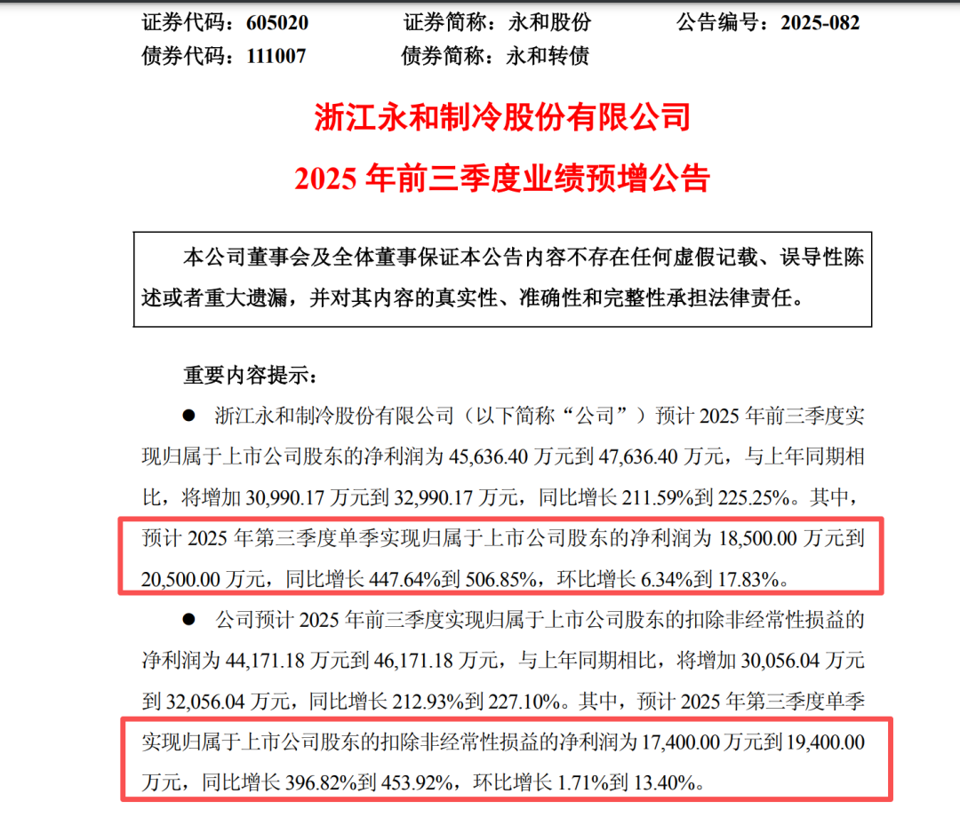 10月8日晚间,永和股份发布2025年前三季度业绩预增公告,公司预计前三季度实现归母净利润4.56亿元至4.76亿元,同比增长211.59%至225.25%,业绩表现亮眼。
