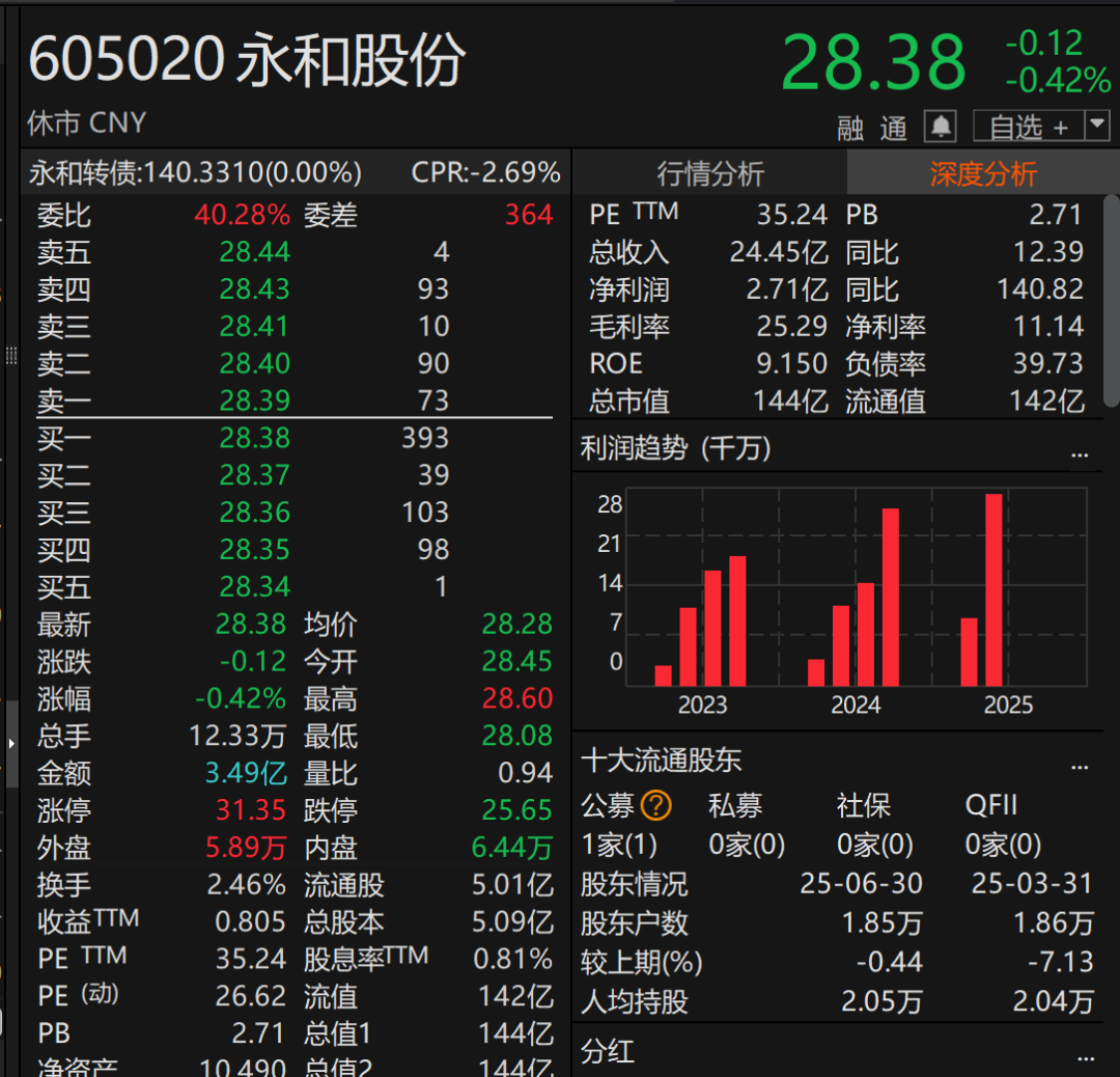 截至9月30日,永和股份报28.38元/股,总市值为144亿元,市场表现稳健。