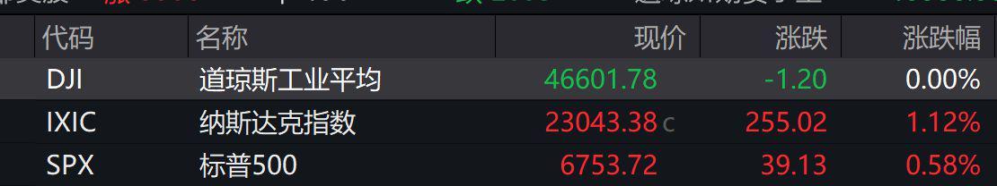 据美东时间10月8日16:00(北京时间10月9日04:00)收盘数据显示,道琼斯指数微跌1.20点至46601.78点;纳斯达克指数大涨255.02点,报23043.38点,涨幅达1.12%;标普500指数上涨39.13点至6753.72点,涨幅0.58%。两大指数盘中最高分别触及23045.14点和6755.64点,均创下盘中历史新高。