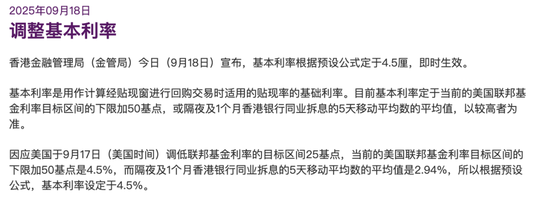 此次调整,源于美国于9月17日(美国时间)调低联邦基金利率的目标区间25基点。根据计算,当前的美国联邦基金利率目标区间的下限加50基点为4.5%,而隔夜及1个月香港银行同业拆息的5天移动平均数的平均值为2.94%。因此,根据预设公式,香港的基本利率被设定于4.5%。