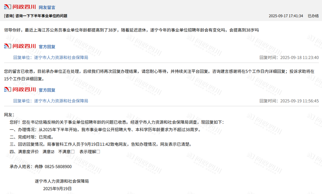 另一个备受关注的趋势是,多地明确提高考编年龄上限。9月下旬,四川绵阳人社局在问政平台回应网友提问时确认:2025年下半年事业单位招聘年龄放宽至38周岁及以上。此外,眉山、遂宁等地也发布类似政策,本科年龄限制调整为1986年10月13日及以后出生,研究生为1981年10月13日及以后出生,退役军人可再放宽2周岁。