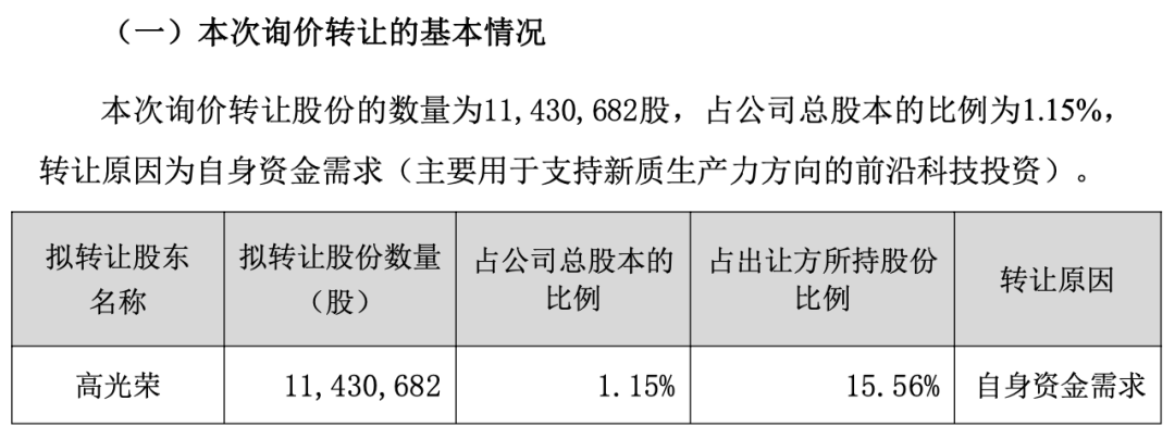 据9月30日晚间公告,高光荣此次转让原因系“自身资金需求”,主要用于支持新质生产力方向的前沿科技投资。公司强调,本次询价转让为非公开转让,不通过集中竞价或大宗交易方式进行,不属于二级市场减持行为。