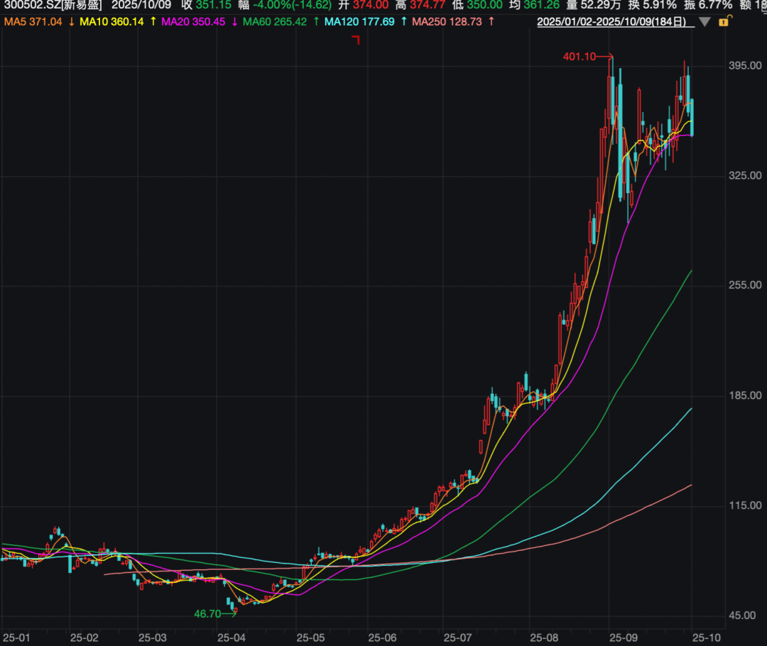 从股价表现看,新易盛今年2月启动上涨行情,4月股价从46.70元/股攀升至9月401.10元/股,区间涨幅接近759%。尽管10月9日受询价转让消息影响下跌4%,但年内累计涨幅仍高达327.06%,市值突破3490亿元。