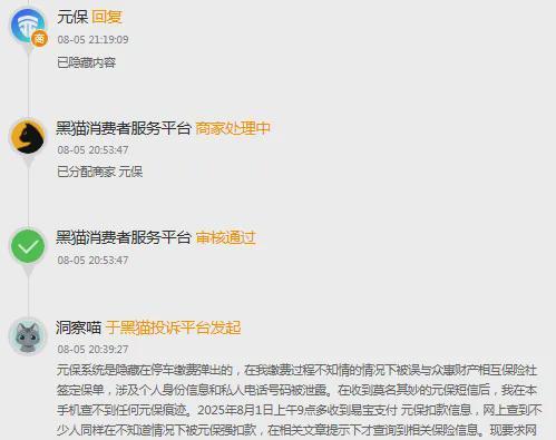 以今年8月的一起投诉为例,受害者表示在停车缴费过程中,元保系统隐藏在缴费软件广告中,导致其在不知情的情况下与某财产相互保险社签订了保单,个人身份信息和电话号码被泄露。随后,受害者收到了元保的短信,但手机中却查不到任何元保的痕迹,不久便收到了易宝支付的元保扣款信息。