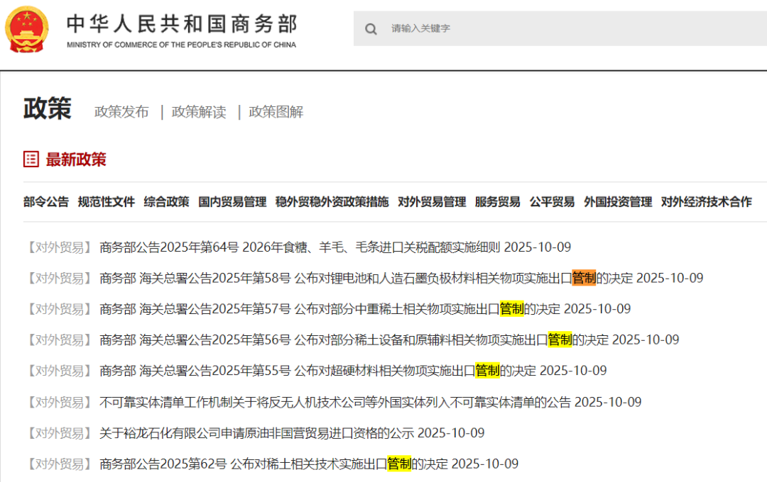 昨日(10月9日),商务部在官网正式发布多份出口管制决定,涵盖中重稀土、稀土设备及原辅料、超硬材料、锂电池和人造石墨负极材料相关物项,自11月8日起正式生效。这一系列措施引发市场广泛关注。