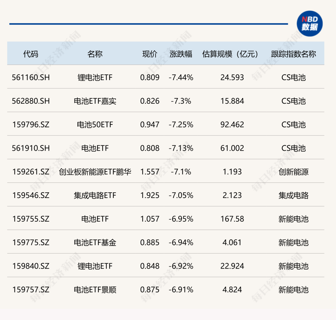 与建材ETF的强势表现形成鲜明对比的是,多只电池相关ETF今日集体下挫,跌幅普遍超过7%。尽管近年来政策支持为电池行业发展注入了强劲动力,国家持续推出新能源汽车鼓励政策,包括以旧换新、充电基础设施建设及新能源下乡等,进一步释放了消费潜力。同时,“反内卷”政策的逐步落地也促使行业竞争趋于理性,整体盈利环境有望改善。但短期内,电池行业仍面临一定的调整压力。