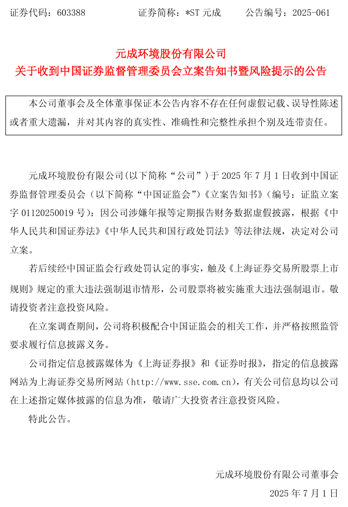 此前,在2025年7月2日,*ST元成发布公告称,因涉嫌年报等定期报告财务数据虚假披露,公司已被中国证监会立案调查。