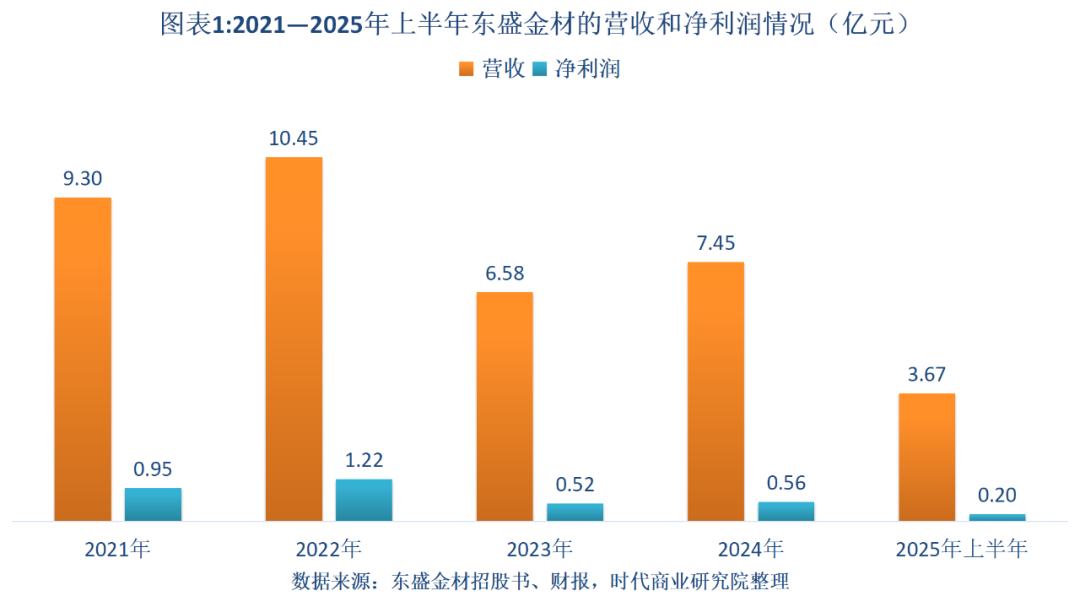 需注意的是,2021—2025年上半年(下称“报告期”),东盛金材的营收和净利润整体呈下降趋势,在第二轮问询中,其经营业绩下滑风险遭到北交所问询。而东盛金材主营产品年收入不到6亿元,市占率却达到全球第一,其产品市场空间亦遭问询。