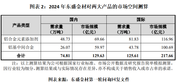 第一轮问询回复文件显示,根据东盛金材的测算,2024年全球铝合金元素添加剂、铝基中间合金的市场规模分别为116.96亿元、100.69亿元,国内的市场规模则分别为69.66亿元、59.97亿元。
