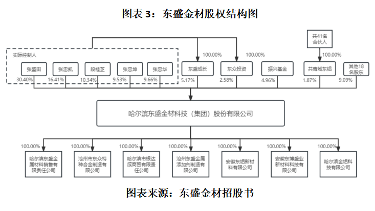 招股书显示,张盛田、段桂芝、张忠凯、张忠华、张忠坤一家为东盛金材的实控人,共直接持有东盛金材76.33%的股份,并通过东盛成长、东众投资间接持有公司7.75%的股份,合计持有东盛金材84.08%的股份。