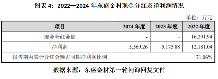 第一轮问询回复显示,2022年5月、12月,东盛金材两次通过股东大会决议进行现金分红,共计分红金额达到1.63亿元,超过当年净利润1.22亿元。另外,根据东盛金材的测算,2022—2024年该公司累计分红金额占同期净利润的比例达到71.06%,或逼近北交所政策红线。