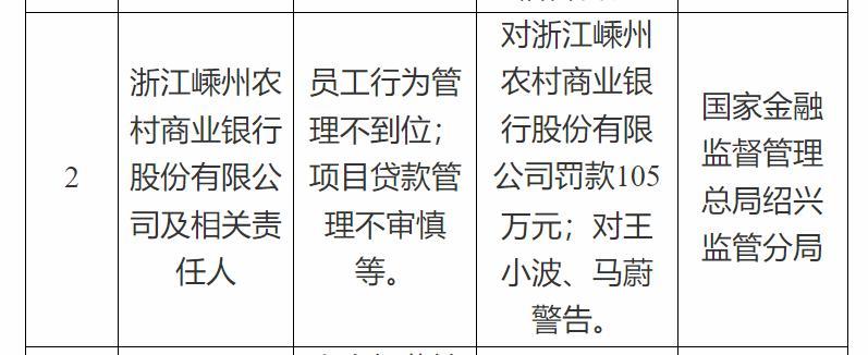 基于上述违规事实,监管部门依法对浙江嵊州农商银行处以105万元罚款。与此同时,直接责任人员王小波、马蔚因对违规问题负有主要责任,被监管部门予以警告处分。这一处罚决定不仅体现了监管部门对违规行为的零容忍态度,也为金融行业敲响了合规经营的警钟。