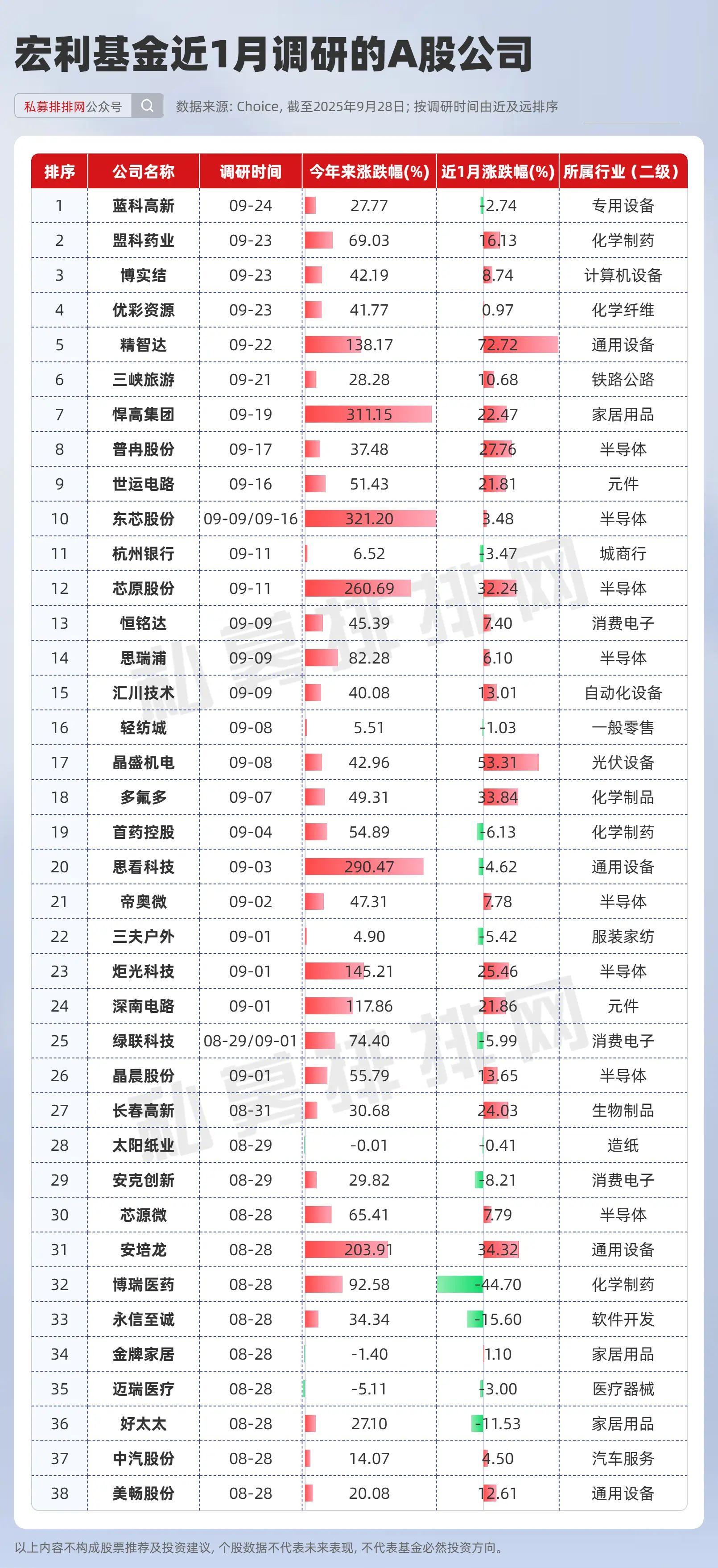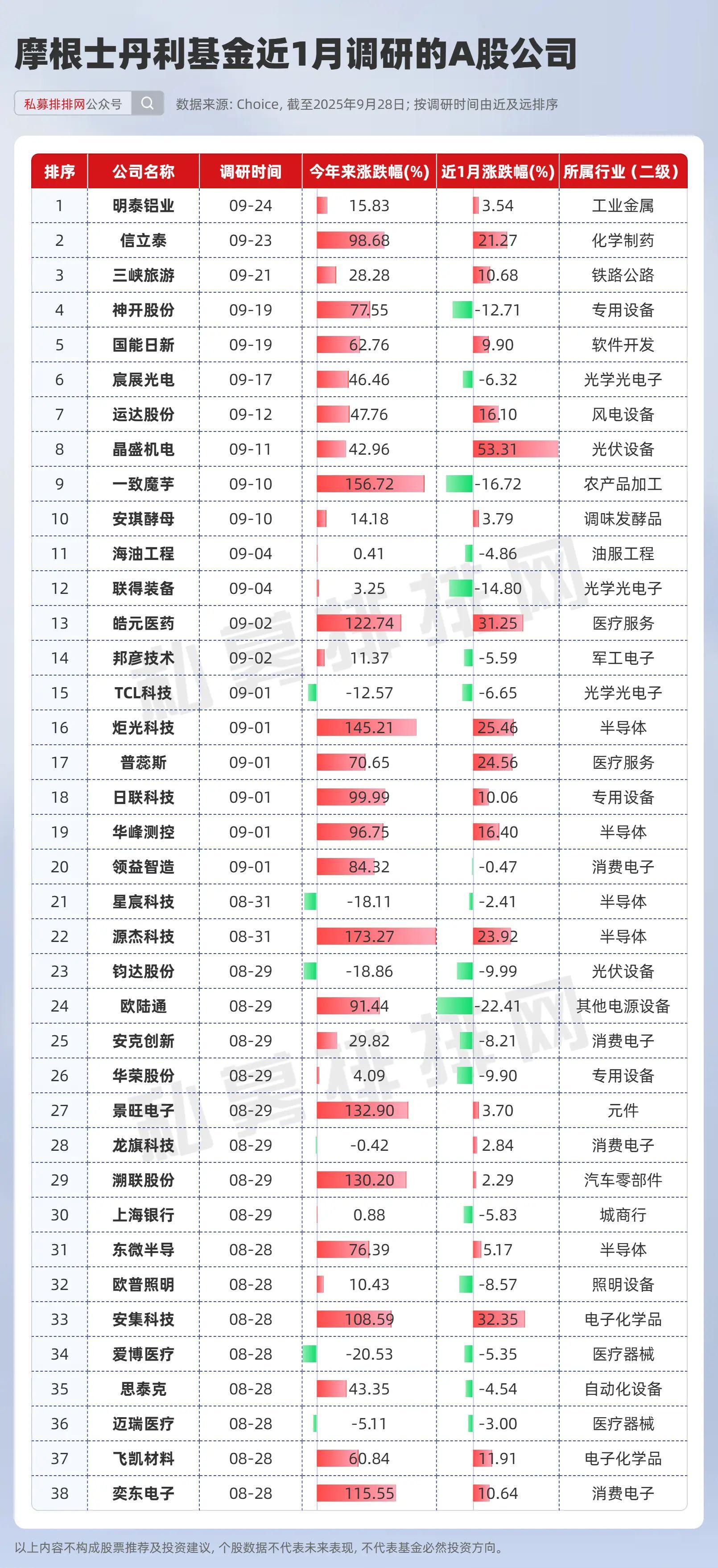 据Choice数据统计(截至2025年9月28日),摩根基金、摩根士丹利基金、宏利基金近1个月对A股公司的调研均接近40家。具体来看: