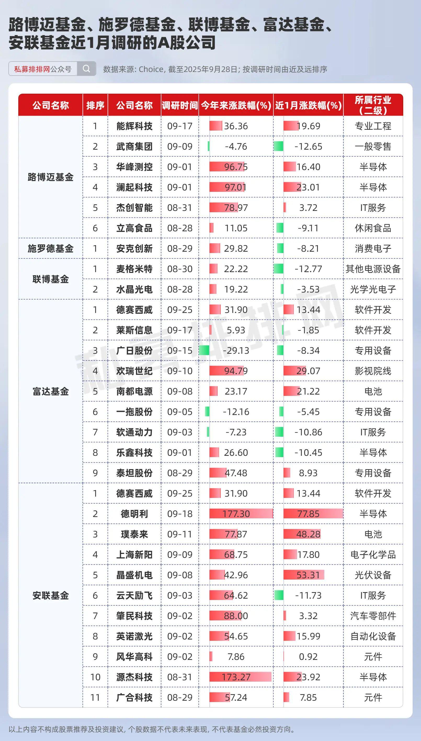 路博迈、施罗德、联博、富达、安联五家机构合计调研28家A股公司,其中德赛西威同时获富达与安联关注。从行业看,半导体(5家)、IT服务(3家)、软件开发(3家)领域企业占比突出。年内12家公司涨幅超50%,2家实现翻倍。