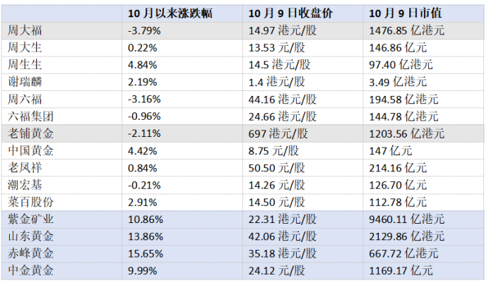 产业链上游企业表现强劲,紫金矿业、山东黄金等企业股价年内涨幅超40%。但下游零售端承压明显,Wind数据显示,10月以来周大福、老铺黄金等品牌股价平均下跌8.3%。特别值得注意的是,老铺黄金股价较7月高点回落35%,市值蒸发超650亿港元。