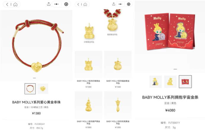 在传统品牌调整策略之际,泡泡玛特通过旗下珠宝品牌popop开启黄金赛道布局。9月12日推出的BABY MOLLY足金系列,采用「IP价值+黄金保值」双属性定价模式:0.7克爱心串珠售价1380元(克价1971元),3克拥抱宇宙金条售价4080元(克价1360元)。这种定价策略已接近老铺黄金高端线水平。