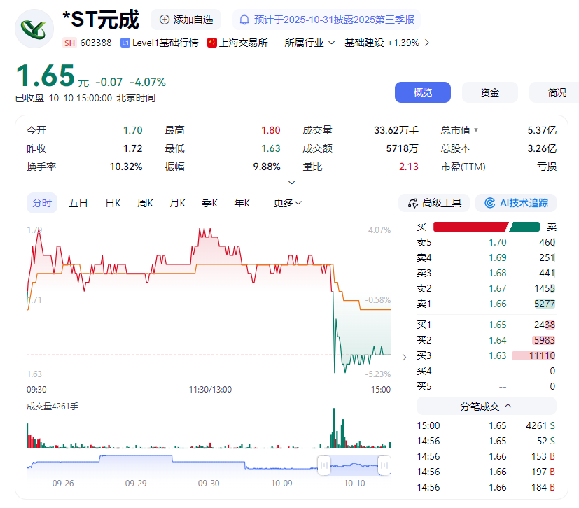 公开资料显示,*ST元成成立于1999年,总部位于浙江杭州。2025年1-6月,公司营业收入构成中,工程施工及绿化养护占比97.39%,景观设计占比2.04%,信息服务及其他占比0.41%,其他业务占比0.16%。截至10月10日收盘,*ST元成股价报1.65元/股,下跌4.07%,总市值5.37亿元。