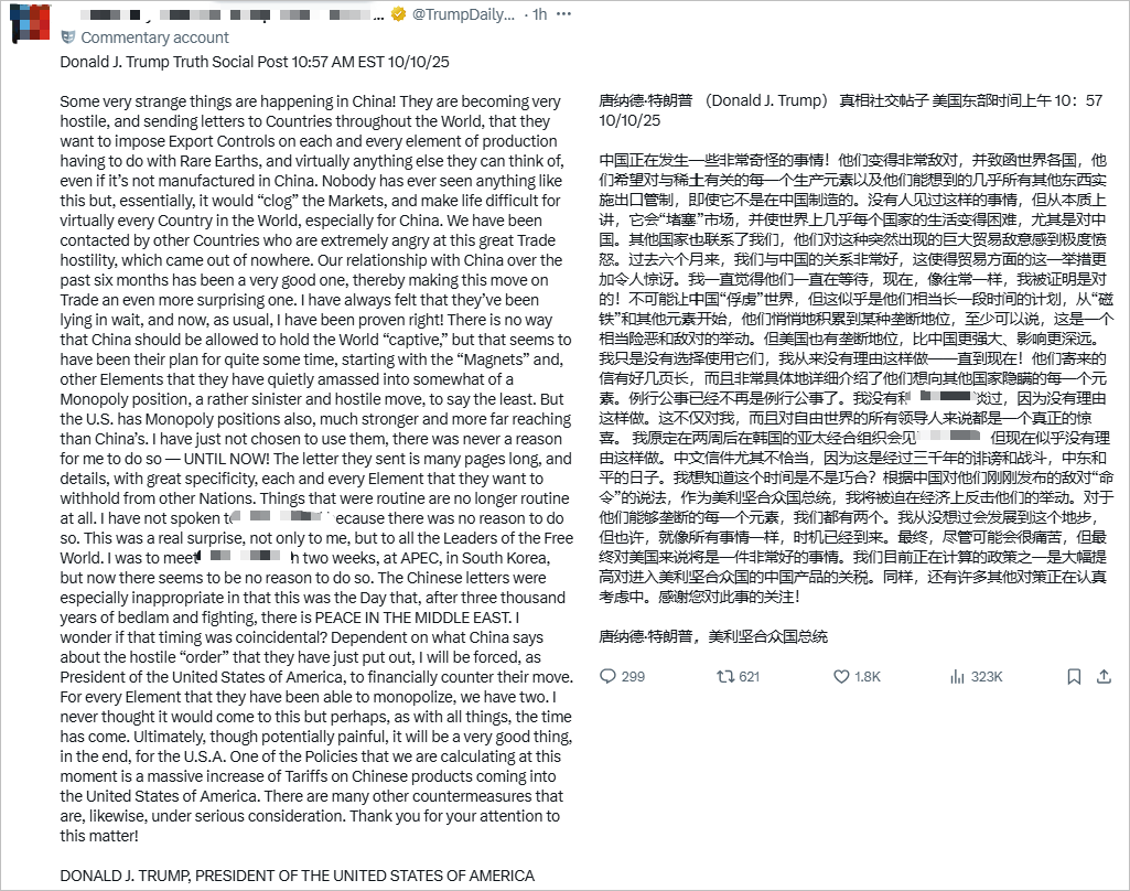 而这次暴跌的原因,同样与特朗普有关。就在美股暴跌前的几分钟,特朗普在其社交媒体上发布了一长段文章,指责我们在稀土出口上实施的管制措施,并发出威胁:打算大幅加征中国商品关税,并考虑其他对策。