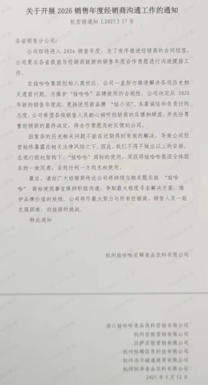 事实上,宗馥莉想要另起炉灶的迹象早已显现。此前,一份名为“关于开展2026销售年度经销商沟通工作的通知”的娃哈哈内部文件在网络上流出。