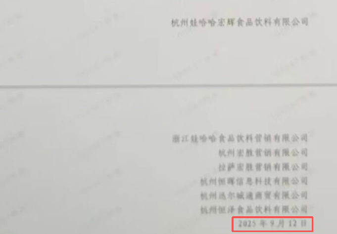 值得注意的是,该文件落款主体为包括杭州娃哈哈宏辉食品饮料有限公司在内的7家公司。
