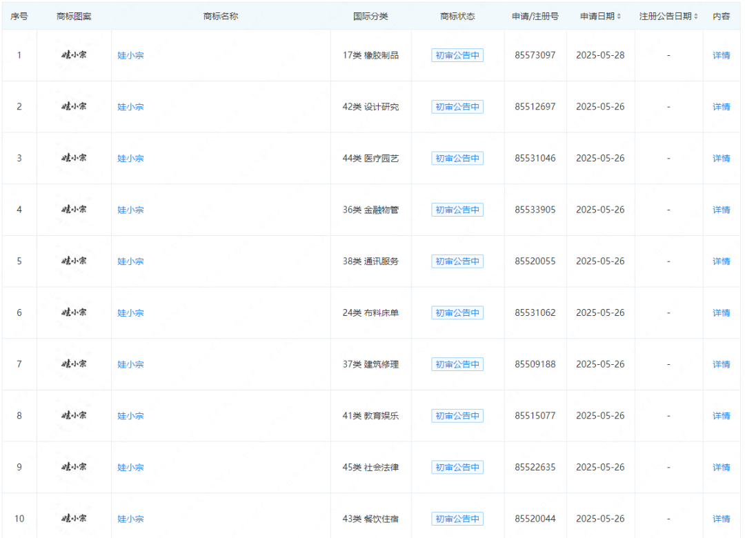 此外,“娃小宗”系列商标也归宏胜集团所有,商标申请日期为2025年2月至5月,涵盖餐饮住宿、办公用品、服装鞋帽、教育娱乐等多个领域。