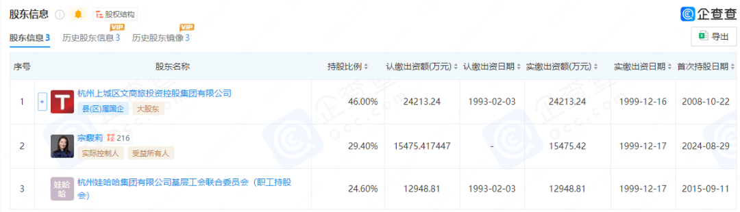其股权结构为:杭州国资持股46%;宗馥莉继承宗庆后,个人持股29.4%;基层工会(职工持股会)持有24.6%。