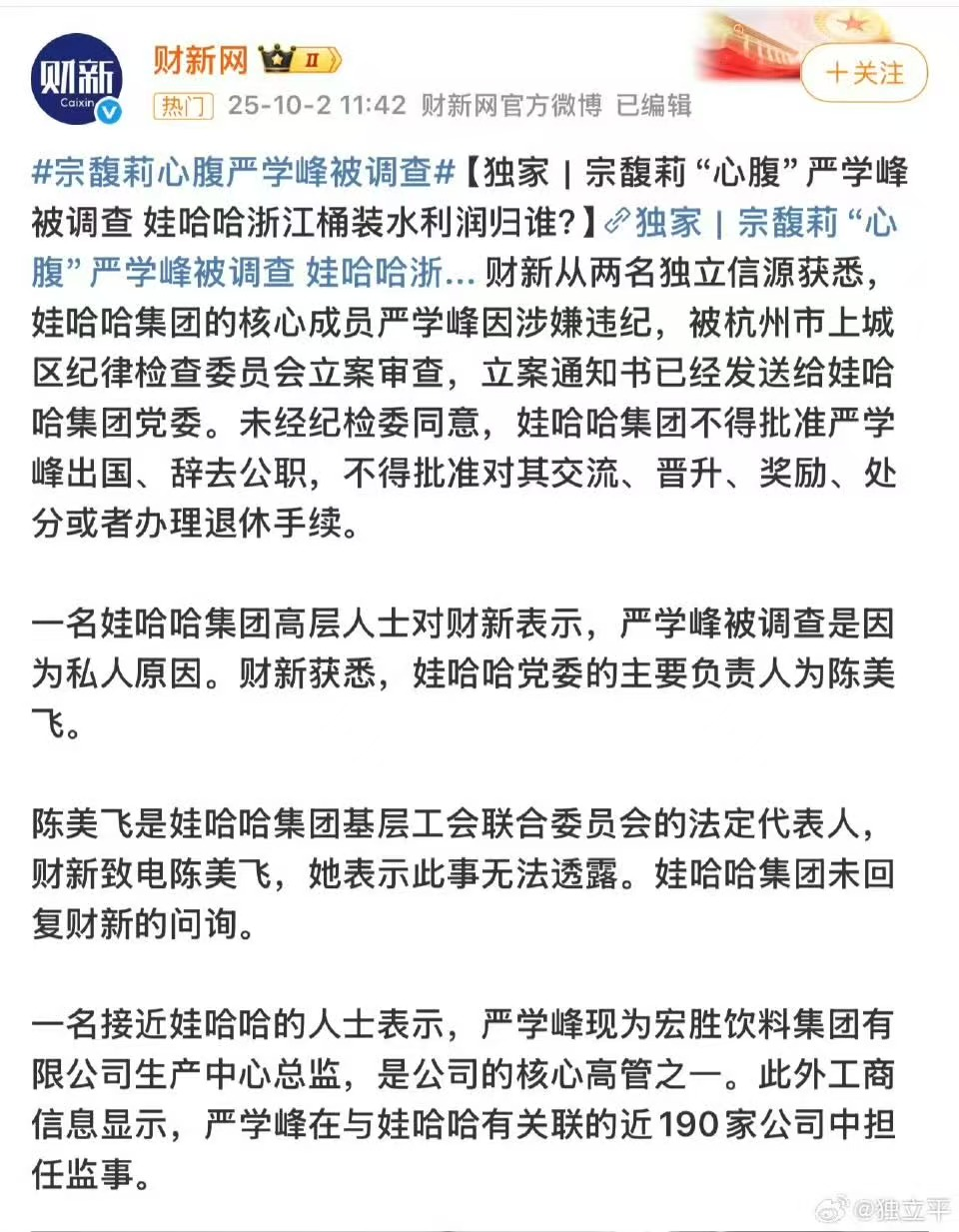 不久之前,宗馥莉的“心腹”严雪峰,忽然被曝因涉嫌违纪,被杭州纪委带走调查。