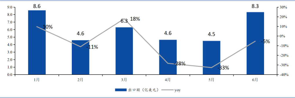 2025年1—6月中国对美国玩具出口额及同比变化(单位:亿美元);图片来自华福证券