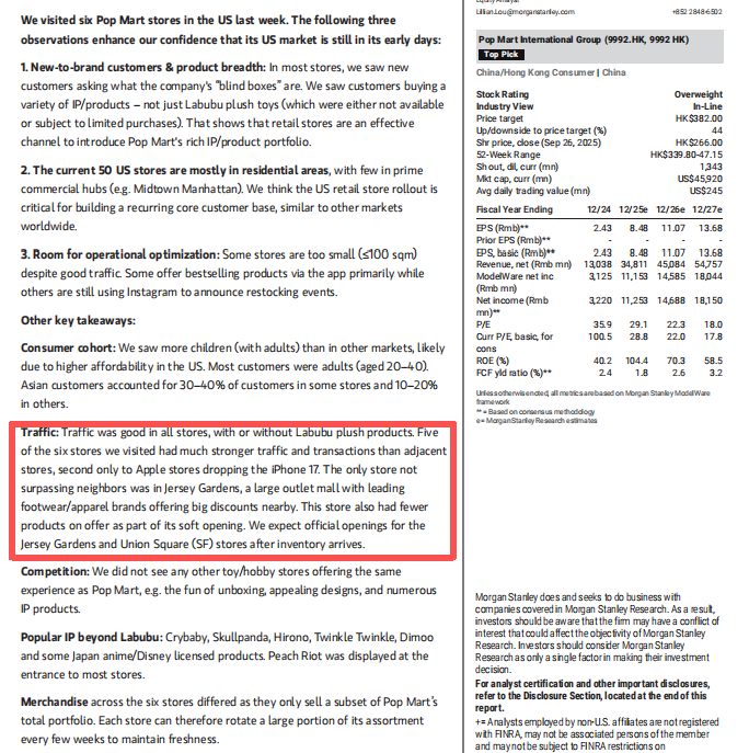 在大摩实际走访的6家美国泡泡玛特门店中,有5家门店的客流量和交易额明显超过周边门店,仅次于苹果。但该份报告依然认为,泡泡玛特在美国的门店仍有优化空间,部分门店面积过小,仅约100平方米,且数字化运营手段有待提升。