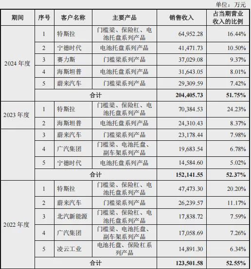 招股书数据显示,2022年至2024年,友升股份分别实现营收23.50亿元、29.05亿元、39.50亿元,同期扣非净利润达2.24亿元、3.19亿元、4.01亿元,业绩呈现快速增长态势。然而,特斯拉的销售收入占比分别达20.20%、24.23%、16.44%,前五大客户合计贡献营收比例更是高达52.55%、52.37%、51.75%,客户集中度风险显著。