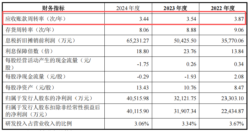 与此同时,应收账款规模激增,报告期内从6.62亿元攀升至12.83亿元,占营收比例从26.76%升至31.03%,坏账准备余额从3580.39万元增长至6970.15万元,应收账款周转率从3.87降至3.44。这些数据表明,在行业竞争加剧的背景下,依赖单一大客户不仅导致回款周期延长,更可能引发坏账风险,对公司财务健康构成威胁。