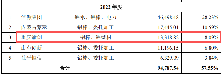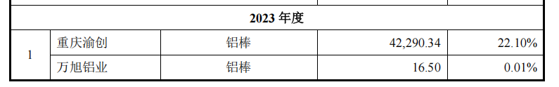 在供应商方面,友升股份长期依赖信源集团、重庆渝创、内蒙古蒙泰、茌平恒信等企业。其中,重庆渝创的崛起尤为引人注目。这家成立于2021年4月的企业,在2022年便跻身友升股份前五大供应商之列,2023年更与万旭铝业共同成为第一大供应商,合计采购金额达4.23亿元。