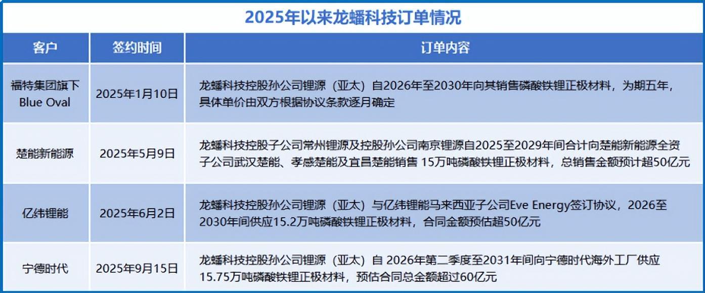 9月15日,龙蟠科技公告称,其控股孙公司与宁德时代签署合作协议,2026年第二季度至2031年间将向宁德时代海外工厂销售15.75万吨磷酸铁锂正极材料。这已是其2025年以来拿下的第四个大单,此前已分别获得Blue Oval(福特电池工厂)、楚能新能源、亿纬锂能的订单。四家客户订单总额超170亿元。