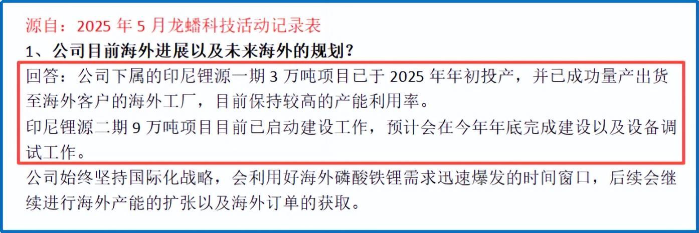随着全球电池产业链向东南亚、欧美迁移,龙蟠科技2021年启动海外布局,成为国内首家在海外建设磷酸铁锂工厂的企业。其印尼生产基地一期3万吨已于2025年年初投产,二期9万吨项目预计年底建成,将成为全球除中国外规模最大的磷酸铁锂基地。