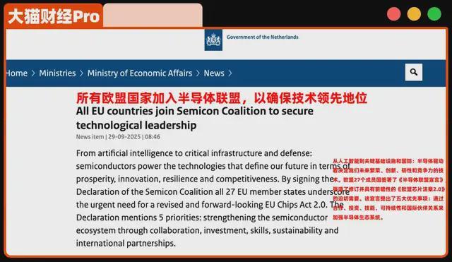 事件背景直指欧盟半导体联盟战略。9月29日,欧盟27国签署《半导体联盟宣言》,宣称要「振兴欧洲在全球芯片产业的地位」。该联盟由荷兰牵头,成员从最初的9国扩展至全欧盟范围。