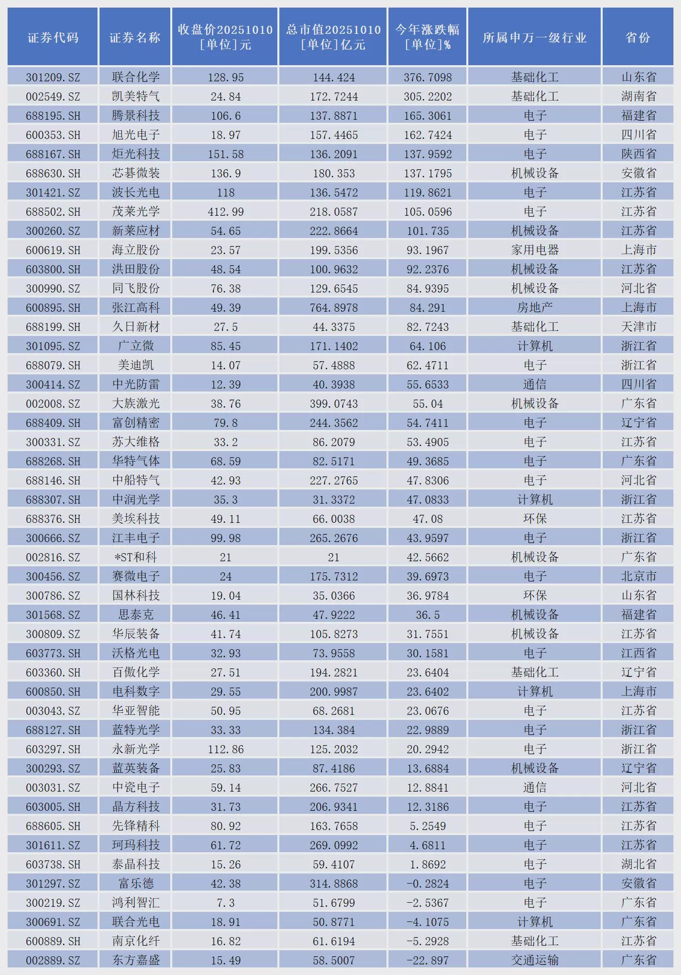 其中,联合化学(301209.SZ)、凯美特气(002549.SZ)、腾景科技(688195.SH)、旭光电子(600353.SH)、炬光科技(688167.SH)、芯碁微装(688630.SH)、波长光电(301421.SZ)、茂莱光学(688502.SH)、新莱应材(300260.SZ)9家公司股价成功实现翻倍。