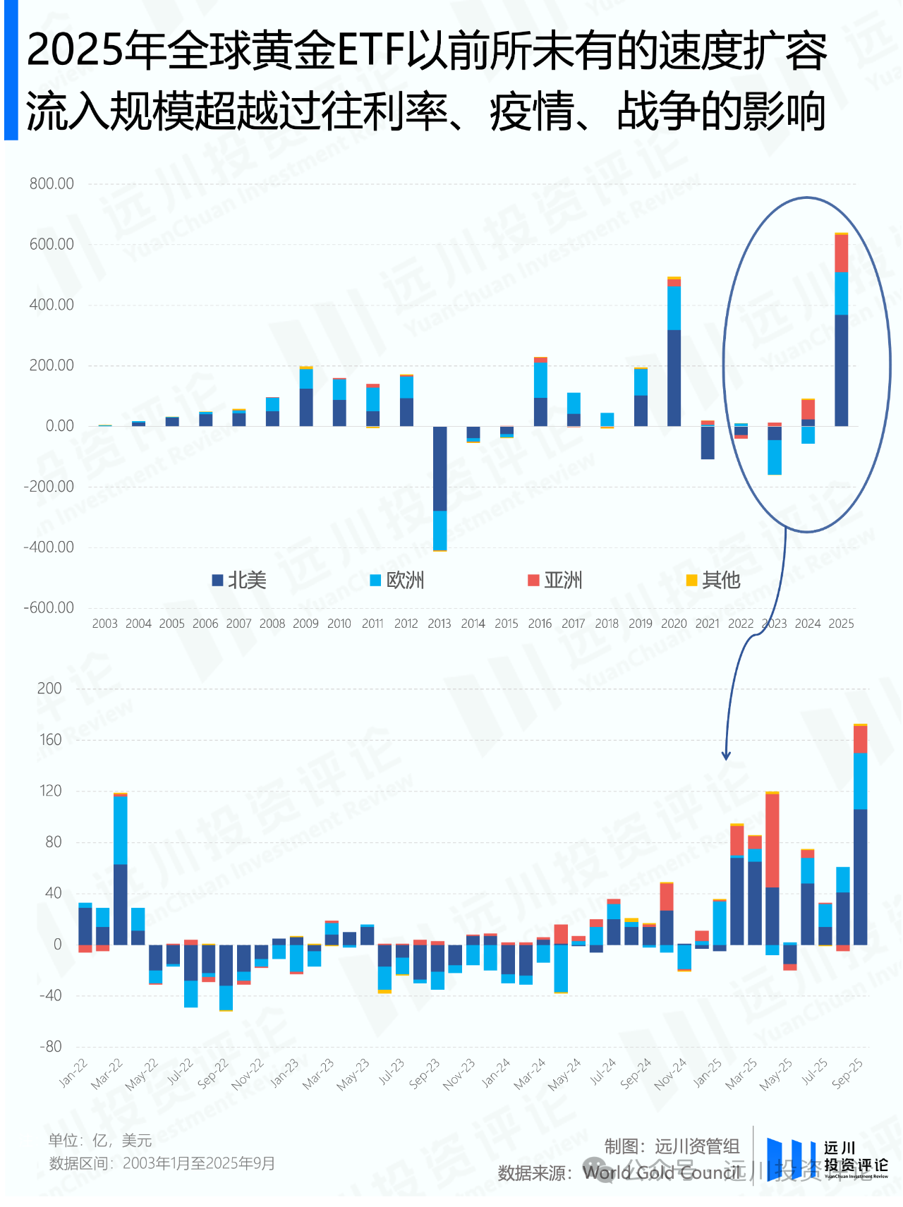 然而,今年以来情况有所改变。相比过去三年,全球央行增持黄金的趋势依然保持不变,但增持速度有所放缓。与此同时,全球黄金ETF却迎来了持续的爆发,尤其是欧美地区的投资者出现了显著的增配现象。