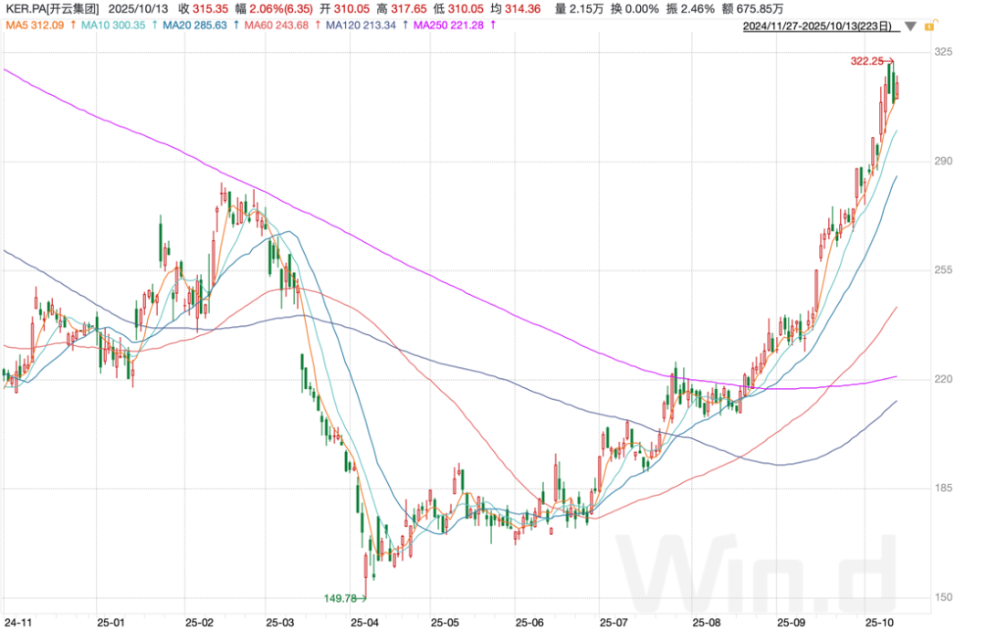 进入今年二季度后,全球奢侈品市场风云变幻,而GUCCI的母公司——法国开云集团(以下简称“开云”)的股价却走出了一波令人瞩目的上涨行情。从4月7日至10月13日,开云股价区间涨幅超过了82%,在同期法国CAC40指数成分股中领涨。然而,在此之前,开云的股价自2021年第三季度至2025年第一季度,经历了长达三年多的震荡下行,期间股价跌去了约80%,可谓“跌至谷底”。