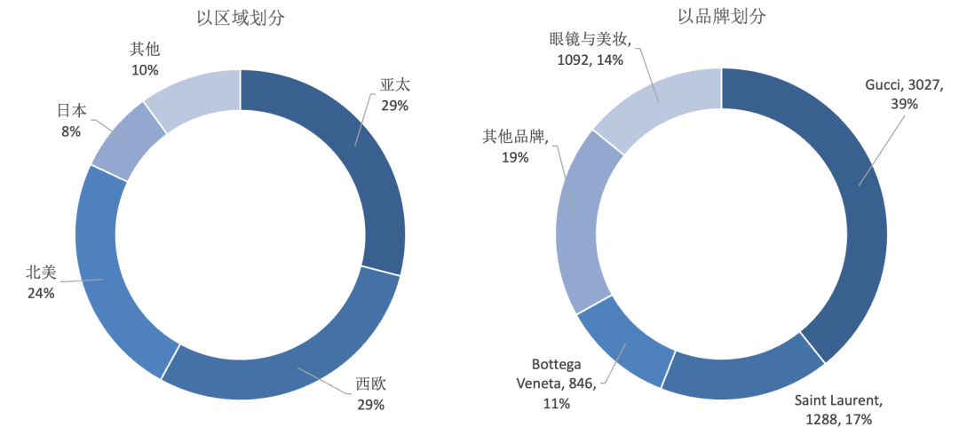 与此同时,核心品牌Saint Laurent同期可比口径收入同比下滑10%,其他品牌可比口径收入同比下滑14%。核心品牌中,只有Bottega Veneta同期的可比口径同比为正增长,但也仅有2%,且BV在同期的收入占比约11%。眼镜&美妆同期可比口径同比增长3%。