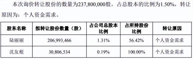陆丽丽是首次转让公司股份,本次转让的股份数额为2.07亿股,占公司总股本的1.31%,占所持股份的比例为56.42%。而沈友根则是第三次转让公司股份,转让的股份数额为0.31亿股,占公司总股本的0.19%,本次转让之后将不再持有公司股份。