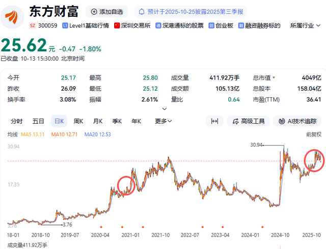 截至10月13日,东方财富股价收报25.62元/股,较前一交易日下跌1.8%,自减持公告发布后股价下跌5.53%,最新市值4049亿元。
