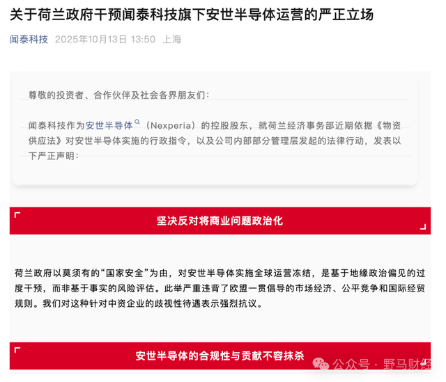10月12日晚间,闻泰科技在官方微信公众号上发布《关于荷兰政府干预闻泰科技旗下安世半导体运营的严正立场》,要求荷兰政府立即撤销错误指令、停止对中国企业的系统性歧视、维护全球半导体产业链的开放与合作。声明强调,半导体产业是全球化的产物,其未来取决于协作而非对抗,各国政府应为企业提供公平、非歧视的营商环境。