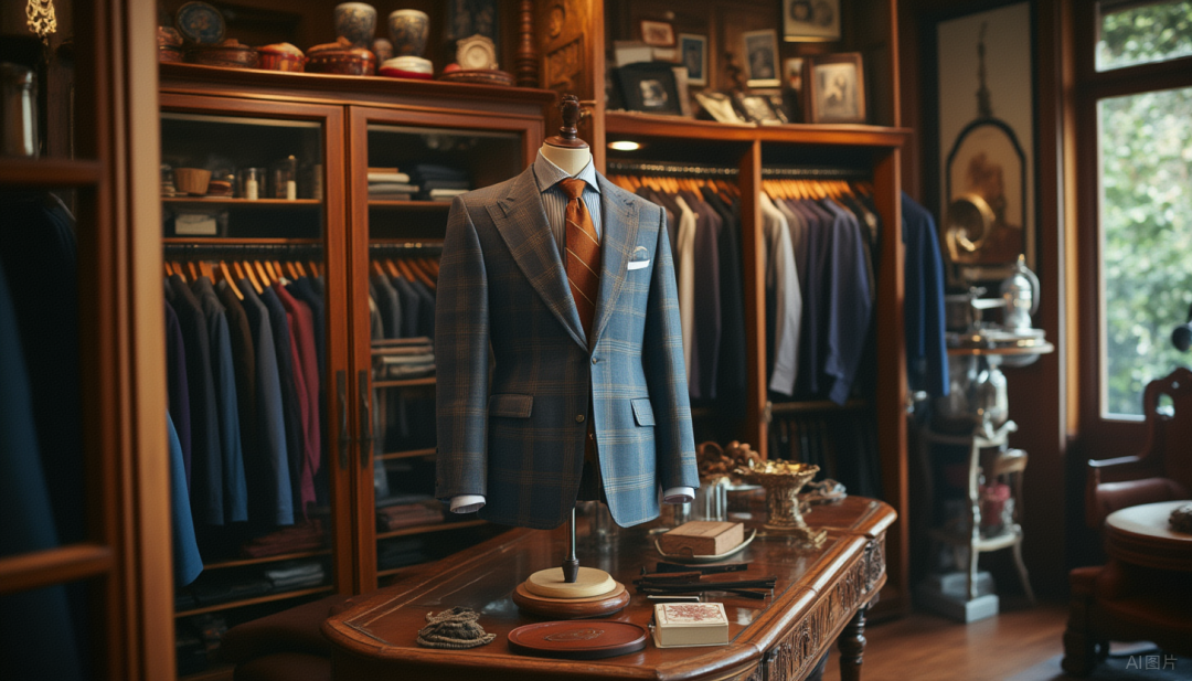 一套定制西装通常包含外套、西裤、衬衫、领带和马甲等,面料选择丰富,工艺复杂,且强调量体裁衣的定制化服务。