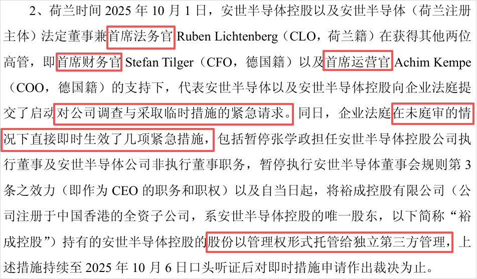 更加震惊的是,三名外籍管理层向企业法庭提交了对闻泰科技的调查。但在未庭审的情况下,直接即时生效了几项闻泰科技对安世控制权转移的措施。