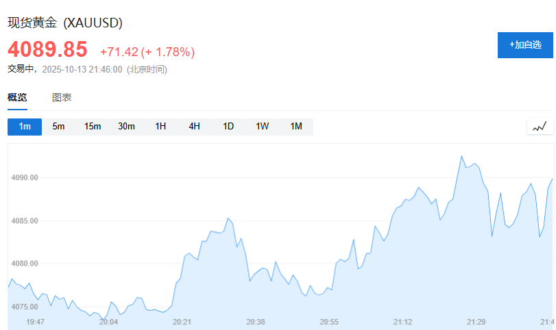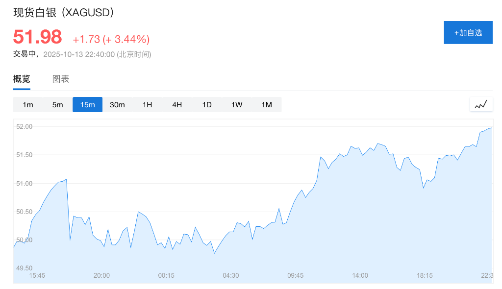 现货黄金在日内表现强劲,大涨2.00%,一度攀升至4090.64美元/盎司,再次创下历史新高。与此同时,白银市场的价格波动更为剧烈,现货白银突破52美元/盎司大关,同样刷新了历史纪录,日内涨幅达到4.07%。