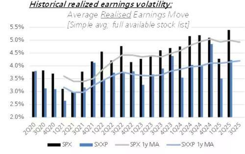据彭博汇编的数据,标普500指数成分股期权暗示的4.7%平均波动幅度,与7月份水平相当。当时,以摩根大通发布财报作为财报季开启标志的预期波动达到2022年来最高水平。瑞银集团策略师表示,美国上季度财报后的实际股价波动达到峰值,自2021年以来一直呈上升趋势,欧洲市场也是如此。然而,花旗集团则指出,股票相关性极低,实际和隐含波动率均接近至少十年来的最低水平。