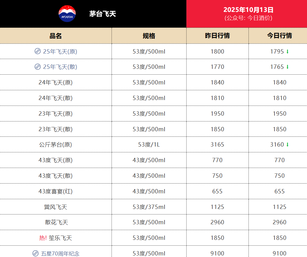 终端市场方面,据今日酒价最新监测数据显示,53度飞天茅台散瓶批发价持续下探,目前报价1765元/瓶。这一价格较2021年历史高点3000元/瓶已累计下跌41%,较2024年同期的2100元/瓶亦有16%的降幅。